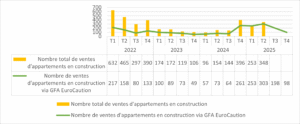 En jaune figurent les données du Statec. Les garanties émises en T3 et T4 (ligne verte), arrêtées -au 20/11/2025, correspondent au nombre de garanties accordées ; un acquéreur ayant acquis plusieurs logements n’a reçu qu’une seule garantie financière d’achèvement, ce qui explique l’écart avec le nombre total de ventes en VEFA.